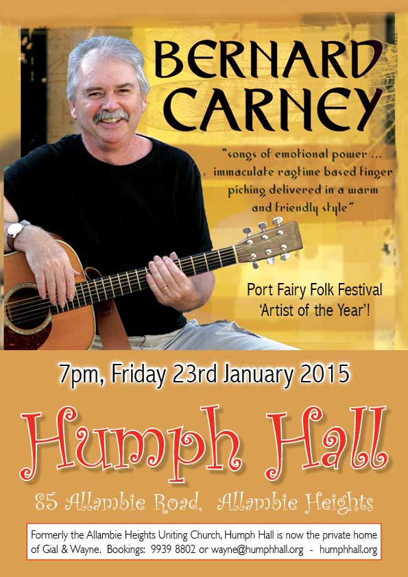 Port Fairy Folk Festival ‘Artist of the Year’ award winner Bernard Carney returns to Humph Hall.