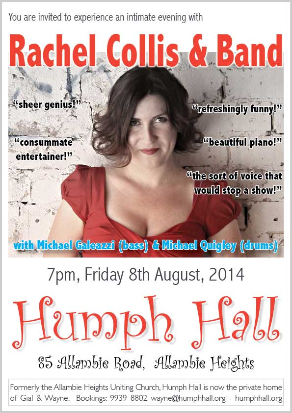 Rachel Collis is coming back to Humph Hall with her band to perform songs from her upcoming album, Nightlight. With Michael Galeazzi (bass) & Michael Quigley (drums).