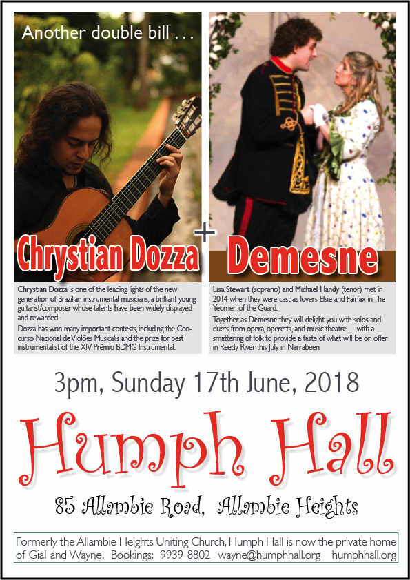 Together they will delight you with solos and duets from opera, operetta, and music theatre...with a smattering of folk to provide a taste of what will be on offer in Reedy River this July in Narrabeen!