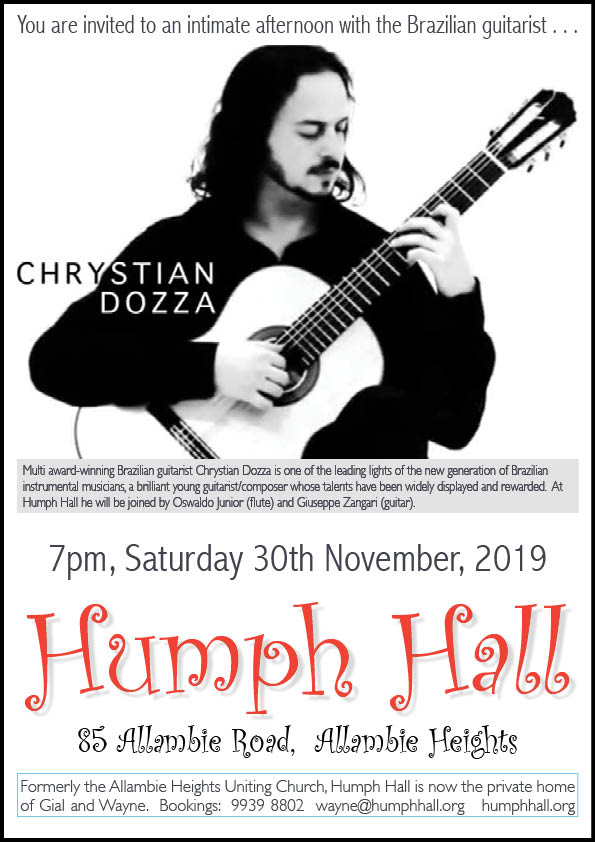 Chrystian has invited a number of his Australian musical friends including Oswaldo Junior (flute) and Giuseppe Zangari (guitar) to join him on stage at Humph Hall.