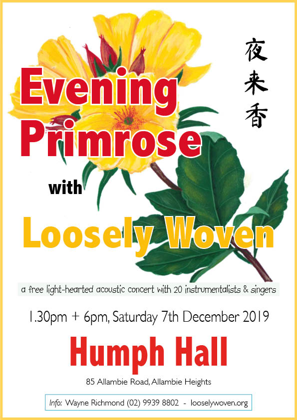 'Evening Primrose' is the third concert for 2019. There will be 7 public performances including two here at Humph Hall. The concert will feature 20 instrumentalists and singers.