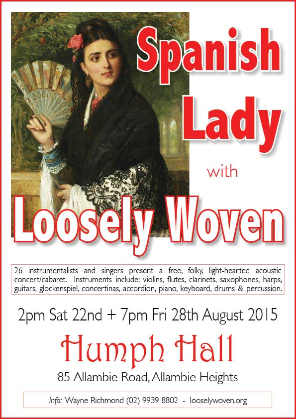 Loosely Woven is a community based group of people who put together and perform two to three new shows each year. 'Spanish Lady' is the second of these for 2015 with 26 instrumentalists and singers. The concert will close with a spectacular arrangement of the traditional title song.