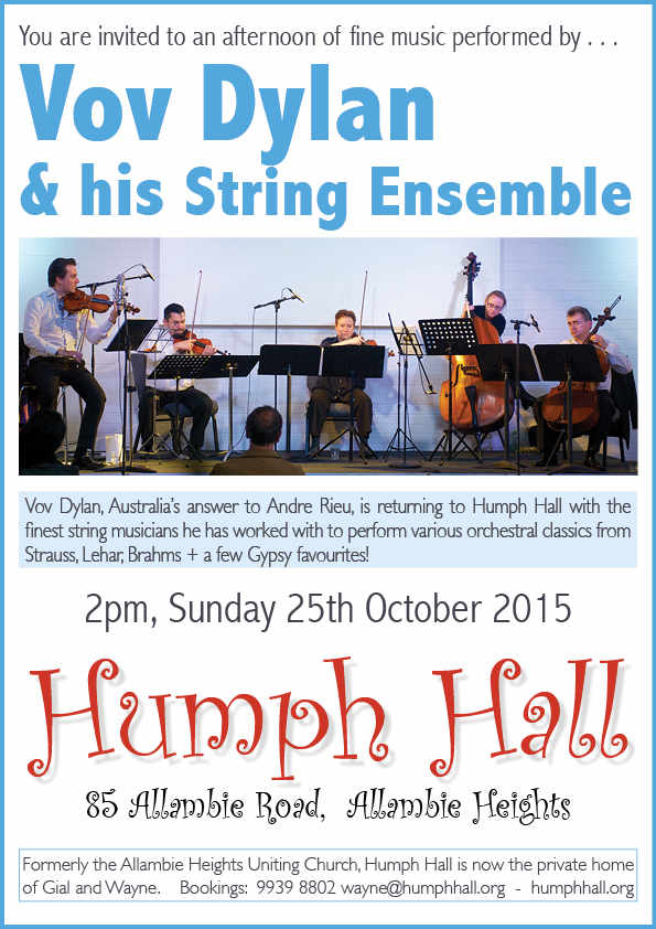 Vov Dylan and his String Ensemble are returning with another delightful afternoon of fine music on Sunday 25th October 2015.