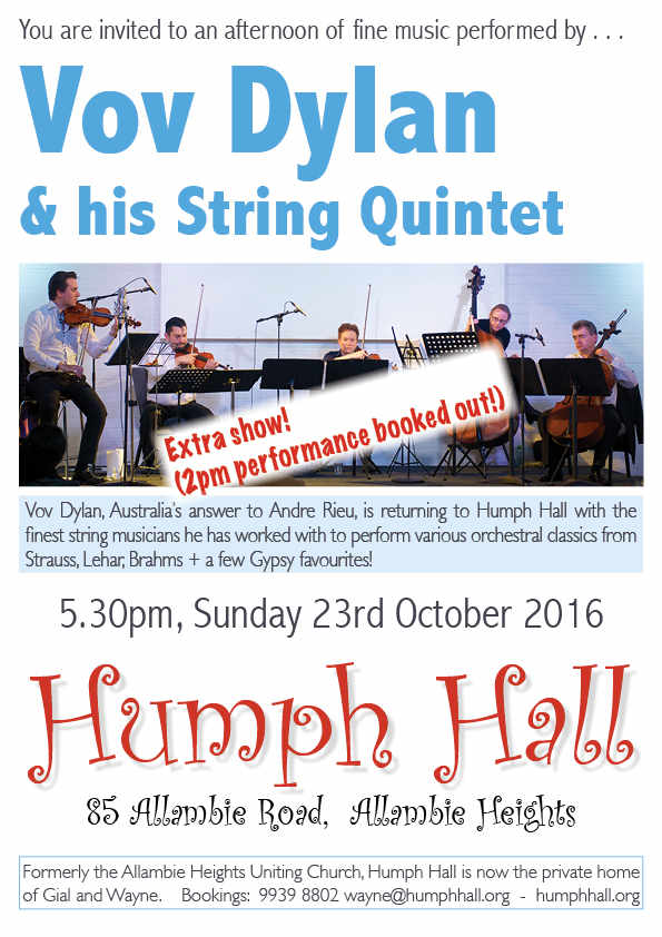 In October 2012 Vov brought together in Humph Hall the finest string musicians he has worked with to present a new and unique show featuring Viennese Orchestral classics from Strauss, Lehar, Brahms plus a few Gypsy favourites! Vov brought new life to these classic works with all new arrangements to give a rich string ensemble sound and a new interpretation of pieces loved by many generations of audiences.