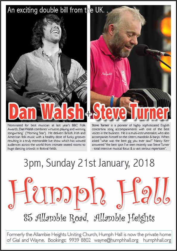 Steve Turner is known as a pioneer of highly sophisticated English concertina song accompaniments, stretching the boundaries of traditional forms, with one of the best voices in the business. He is a multi-instrumentalist, who also accompanies himself on the cittern, and also plays mandolin and banjo.