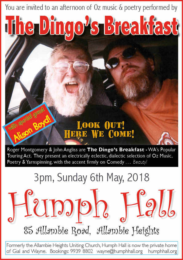Dingo’s Breakfast concerts are a wonderful mix of Traditional and Contemporary Australian and Irish Songs, lavishly salted with an edgy slam of Performance Poetry. The Dingo’s have comprehensively proved that Performance Poetry is not just for breakfasts any more.